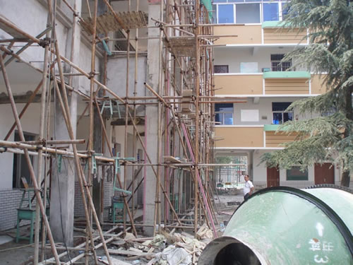 鎮(zhèn)江市桃園中心小學教學樓,為三、四層磚混結構房屋,始建于七八十年代,不符合抗震要求,該工程采用新增鋼筋砼柱、增大樓板支座、鋼網(wǎng)粉墻體等方法進行加固補強。