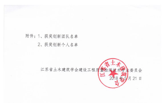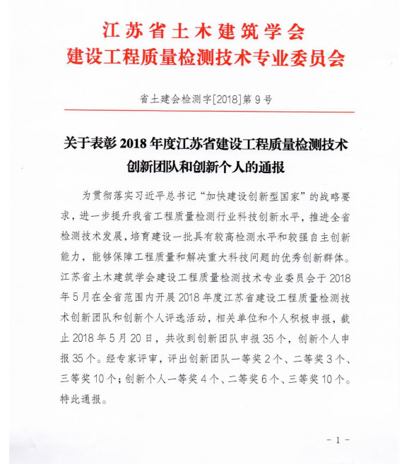 江蘇省土木建筑學(xué)會(huì)建設(shè)工程質(zhì)量檢測(cè)技術(shù)專業(yè)委員會(huì)于2018年5月在全省范圍內(nèi)開展2018年度江蘇省建設(shè)工程質(zhì)量檢測(cè)技術(shù)創(chuàng)新團(tuán)隊(duì)和創(chuàng)新個(gè)人評(píng)選活動(dòng)。鎮(zhèn)江市建科工程質(zhì)量檢測(cè)中心有限公司取得優(yōu)異成績(jī)。“鎮(zhèn)江建科檢測(cè)研究二部”獲創(chuàng)新團(tuán)隊(duì)三等獎(jiǎng),中心馬偉誠(chéng)、周偉、華實(shí)等三人分獲創(chuàng)新個(gè)人一、二、三等獎(jiǎng)。這是對(duì)中心長(zhǎng)期堅(jiān)持開展科技創(chuàng)新工作的肯定,更加激勵(lì)中心上下以更大熱情投身科研工作!
