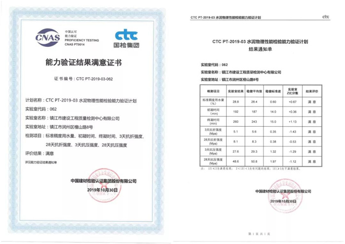 我中心于2019年6月至8月參加了由中國(guó)建材檢驗(yàn)認(rèn)證集團(tuán)股份有限公司組織的CTC PT-2019-03水泥物理性能檢驗(yàn)?zāi)芰︱?yàn)證--全國(guó)性比對(duì),我中心的檢測(cè)結(jié)果為滿(mǎn)意,順利通過(guò)了此次能力驗(yàn)證。