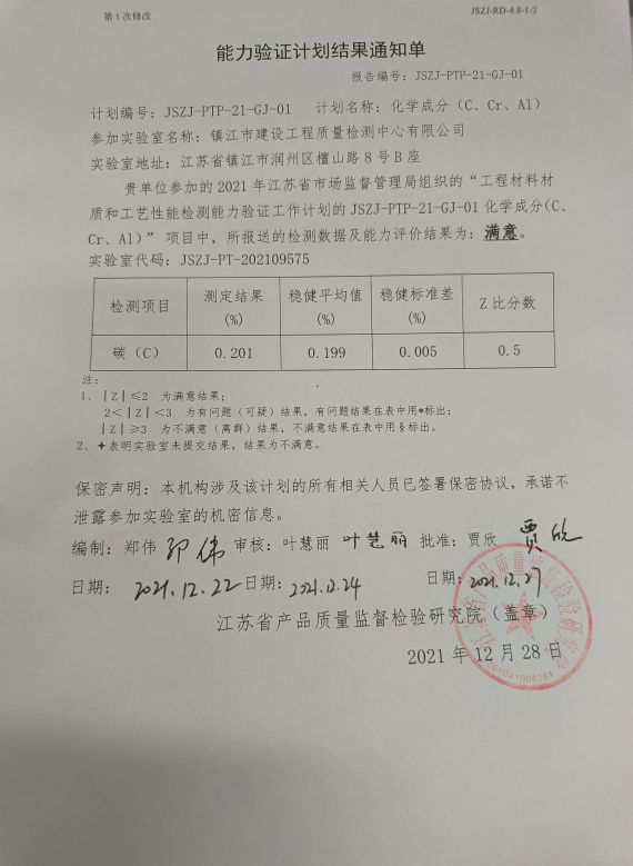 2021年10月,檢測中心參加了由江蘇省市場監(jiān)督管理局組織的工程材料材質和工藝性能檢測能力驗證-化學成分能力驗證計劃(JSZJ-PTP-21-GJ-01)。本計劃由江蘇省產品質量監(jiān)督檢驗研究院/國家工程復合材料產品質量監(jiān)督檢驗中心負責實施。對鋼樣中碳元素的含量進行檢測,提交的檢測結果評價為“滿意”,順利通過此次能力驗證。