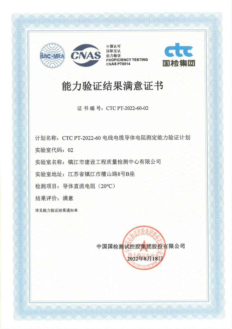 為檢驗我中心實驗室的檢測水平,2022年6月,我中心報名參加了中國國檢測試控股集團股份有限公司組織的“CTC PT-2022-60電線電纜導(dǎo)體電阻測定”能力驗證,2022年8月收到能力驗證結(jié)果通知單,我中心提交的檢測結(jié)果評價為“滿意”。