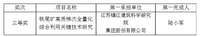 9月28日,由鎮(zhèn)江市住房和城鄉(xiāng)建設(shè)局推薦,我院牽頭申報的“鐵尾礦高質(zhì)梯次全量化綜合利用關(guān)鍵技術(shù)研究”榮獲江蘇省建設(shè)科技創(chuàng)新成果三等獎,陸小軍副院長為第一完成人。