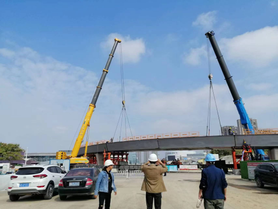 鋼箱梁于6月中旬開始廠內(nèi)加工制作,至9月中旬完成,至10月中旬完成廠內(nèi)除銹涂裝,10月18日開始首件吊裝,并開始地鐵段的現(xiàn)場拼裝,至10月29號完成場內(nèi)地鐵段的胎架上拼裝并檢測合格,10月30日,由兩臺500噸汽車吊,位于地鐵外2米以外,雙機(jī)抬吊將重達(dá)132噸的跨地鐵段的箱梁吊裝落座,完成中間段箱梁的合攏。