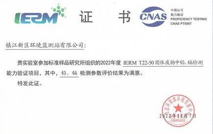 鎮(zhèn)江新區(qū)環(huán)境監(jiān)測站有限公司2022年8月20日-30日參加了生態(tài)環(huán)保部環(huán)境發(fā)展中心環(huán)境標準樣品研究所組織的“IERM T22-50 固體廢物中鉛、鎘能力驗證”,結果前期準備,檢測二科精準分析,公司最終以Z值鉛為0.61、鎘-0.08(Z值絕對值小于2為滿意)的結果順利通過此次能力驗證。
